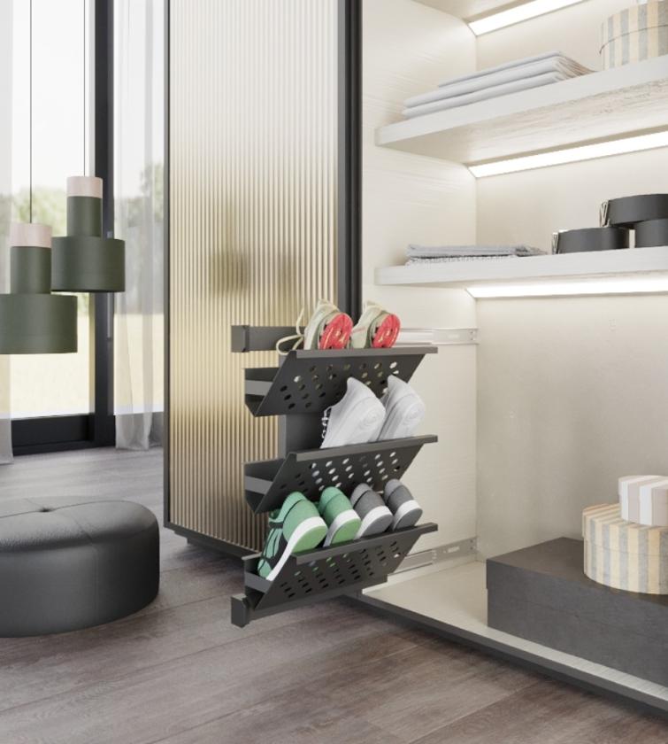 Box structure printed and painted metal with wooden details or of painted round wire. All baskets are equipped with Grass Nova Pro full extension slides or Salice Futura part extension slides.